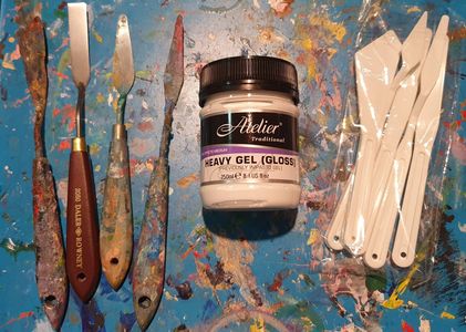 I use a variety of Palette knives. They are good for oil painting or acrylic painting. Here are a few of my favourite shapes. I would recommend you get a rectangle and a triangle. I also use the Atelier Heavy Gel Gloss Impasto Medium when using Acrylic paint. We have packs of plastic palette knives for sale as part of our discounted art supplies. Contact us for more info.