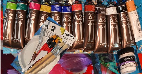 Want to continue with regular lessons? This pack is for you. 11 tubes of 120ml of all colours we use in the studio of CHROMA A2 Heavy Body Acrylics. Includes Green Light, Phalo Green, Alizarin Crimson, Cadmium Yellow Light, Ultramarine Blue, Phalo Blue, Cadmium Scarlet, Light Red Oxide, Burnt Umber, Titanium White, Ivory Black and Chromacryl Skin Tone Base 75ml. Plus 250ml Atelier Heavy Gel Gloss Medium, Metal Painting Knife, Plastic palette knife, palettes, and brush selection. Plus 2 30cm x 40cm stretched canvases.