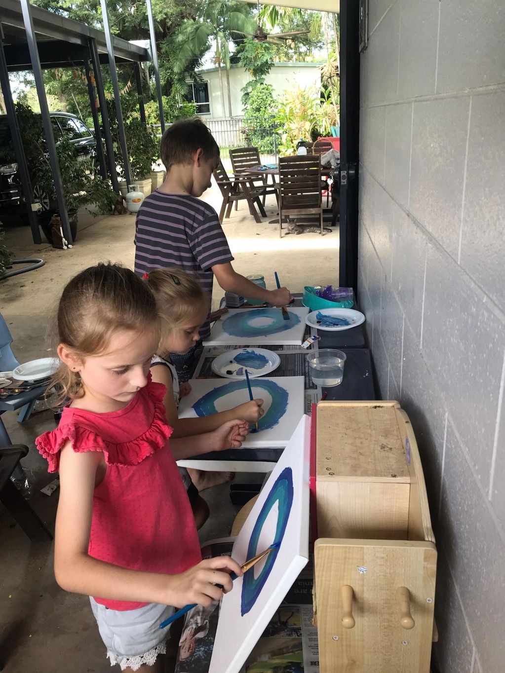 Liam, 10, Emila 7, and Ruby, 5, from Townsville, North Queensland, all enjoyed painting "Coral Reef"